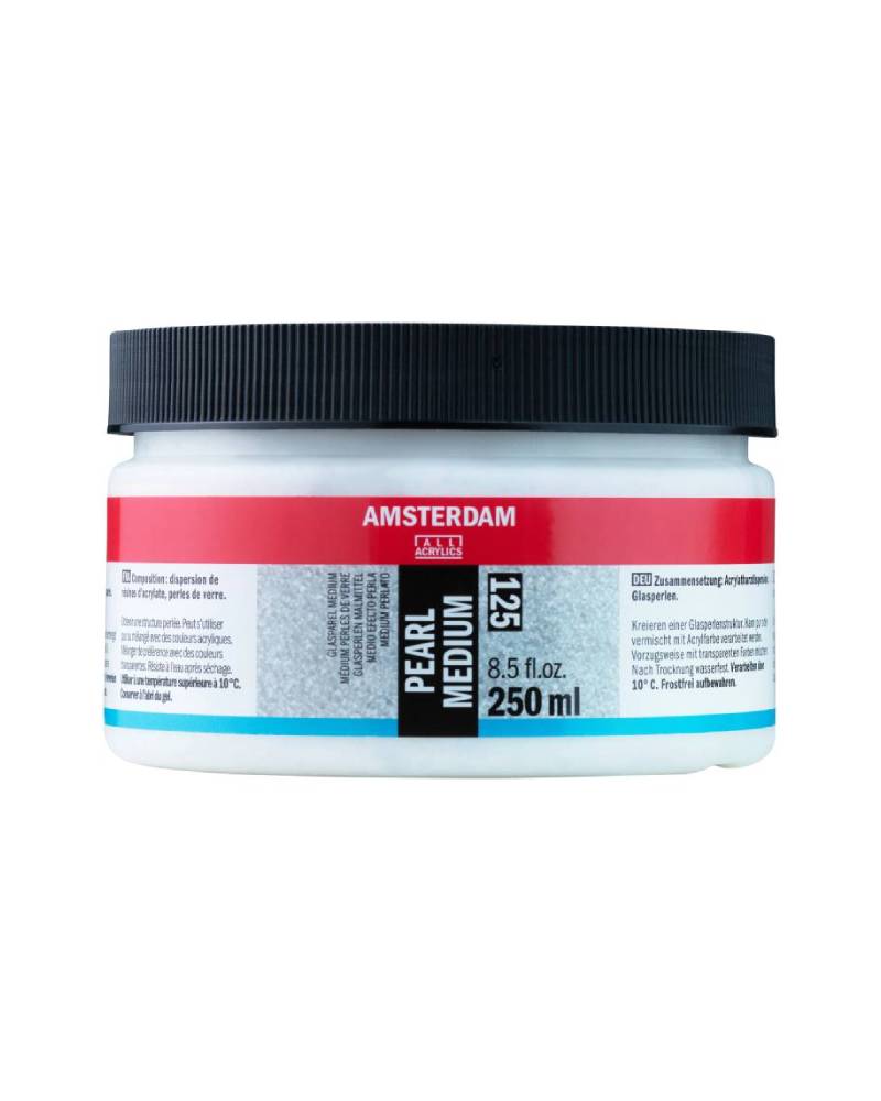 Amsterdam Pearl Medium è un medium innovativo progettato per artisti e appassionati di mixed media che desiderano aggiungere un effetto speciale e tridimensionale alle proprie opere. Questo medium contiene piccole perle di vetro rotonde che, se applicate direttamente o miscelate con pittura acrilica trasparente, creano una texture elegante e luminosa simile a perle di vetro. L’uso del Amsterdam Pearl Medium permette di trasformare superfici piatte in composizioni con profondità , luce e movimento, rendendo ogni opera unica e originale.
