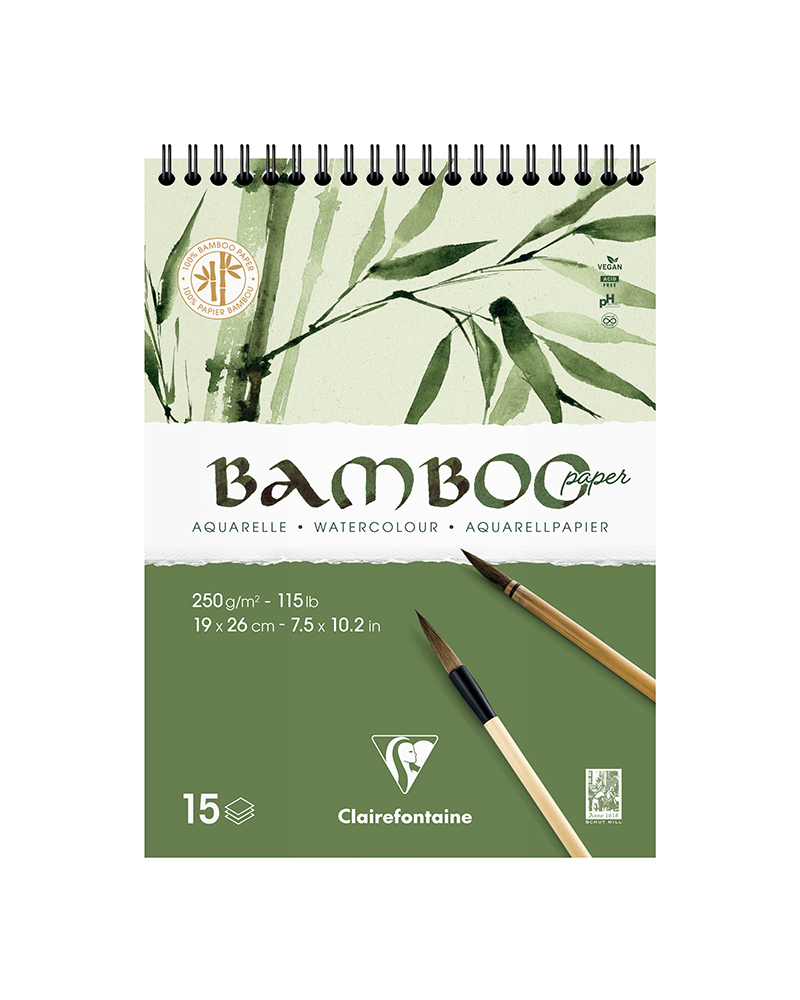 Il Nuovo blocco di Bambù Clairefontaine con spirali ha una carta per acquerello di colore bianco sporco, unica, fatta di bambù naturale al 100%,  che la rende più ecologico dei tradizionali blocchi per acquerello. La grammatura di 250 g/m² lo rende sufficientemente spesso da non far passare la vernice ai fogli successivi, anche durante l’applicazione di successivi strati di vernice. Oltre ai colori ad acquerello, è consigliato anche per schizzi, disegni con carboncino, matita, sanguigna, pastelli e tecniche miste.