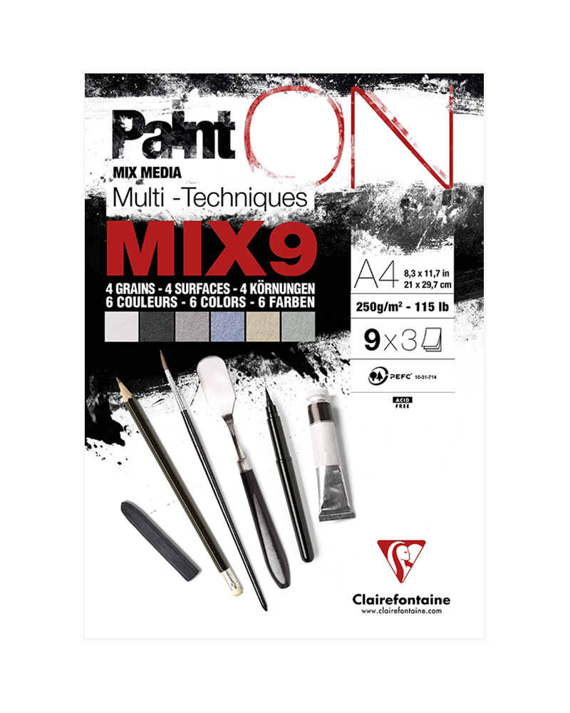PaintON Mix9 è un’eccellente serie di carte Mix-Media del marchio Clairefontaine! Scopri 9 tipi di carta in 6 colori e fino a 4 texture diverse. Il blocco di carta Mix9 di alta qualità è dedicato alla combinazione di supporti asciutti e bagnati come matite, pastelli, pennarelli, penne sottili, pennarelli, inchiostro e inchiostro.