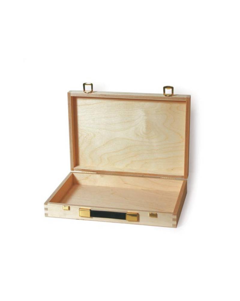 Questa valigetta in legno si chiude come una comoda cassetta portacolori grazie ai suoi ganci metallici e al manico robusto, che ne permettono un trasporto sicuro e agevole. È pensata per contenere godet, tubetti, pennelli e piccoli accessori, offrendo una capienza adeguata a vari usi artistici.