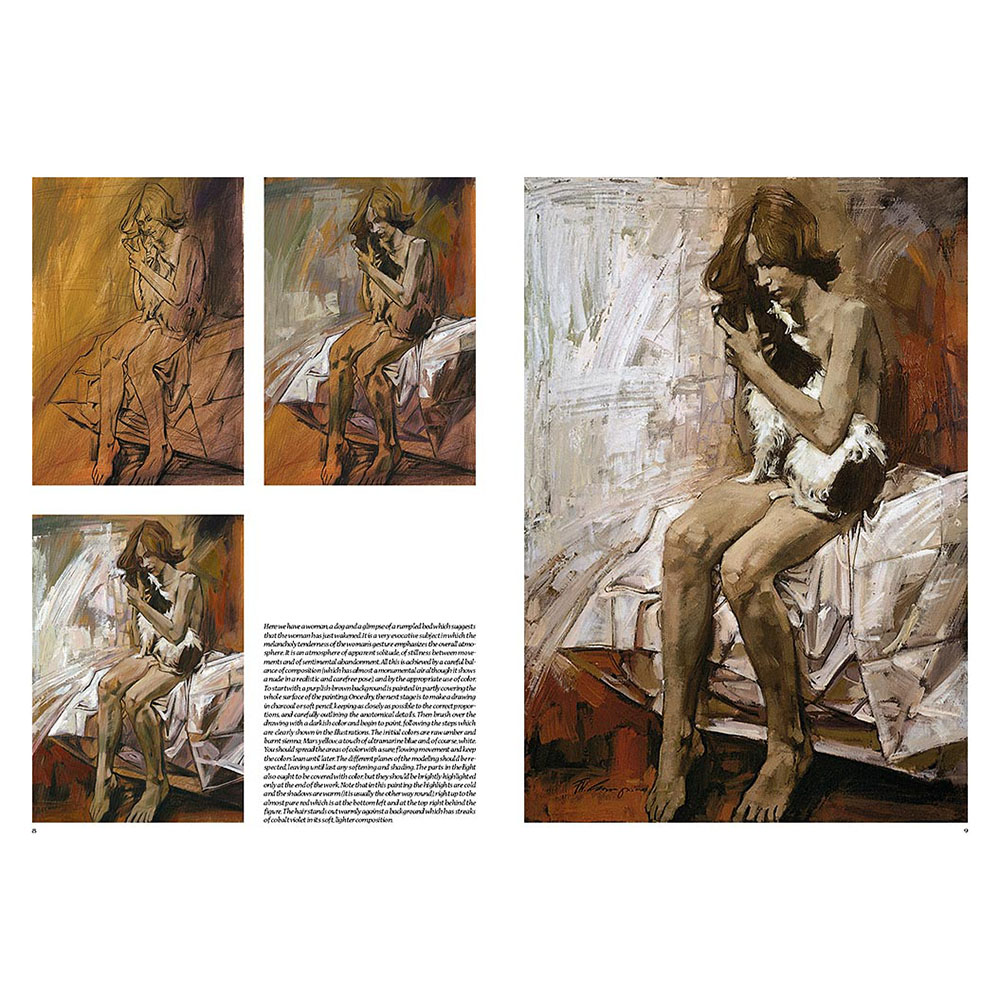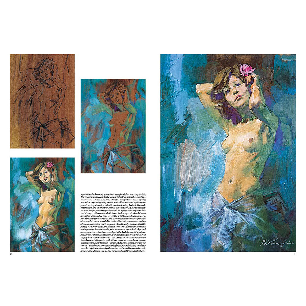 Nelle pagine dedicate al colore, il nudo è rappresentato principalmente con la tecnica a olio, che consente di studiare luci, ombre e tonalità in modo dettagliato e realistico. Per la sezione in bianco e nero, invece, sono presentati disegni eseguiti con matita e carboncino, materiali che aiutano a sviluppare la capacità di catturare forme e volumi con grande precisione.