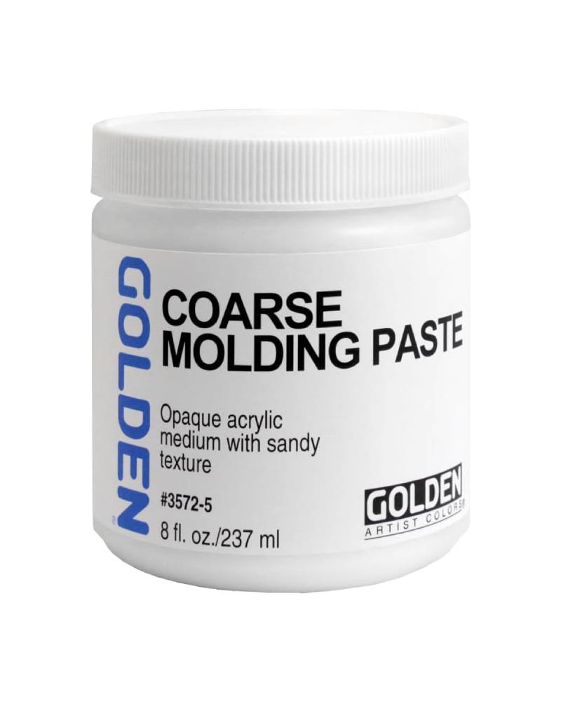 La Golden Coarse Molding Paste può essere applicata direttamente sul supporto con spatola o pennello rigido per creare texture marcate. È possibile miscelarla con colori acrilici per ottenere impasti colorati e densi. Una volta asciutta, la pasta forma una pellicola rigida ma flessibile, resistente nel tempo e compatibile con altri prodotti Golden.