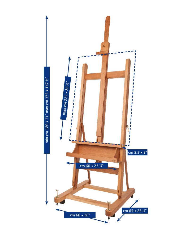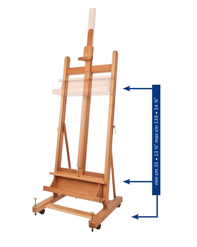 La cremagliera integrata regola con precisione il movimento dell’asta centrale, che è anche allungabile, permettendo di lavorare su tele di grandi dimensioni. Con una portata massima di 30 kg, il cavalletto supporta anche quadri di grande formato in piena sicurezza. Il peso del cavalletto è di 18,5 kg, indice della sua robustezza, ma resta comunque facilmente trasportabile.