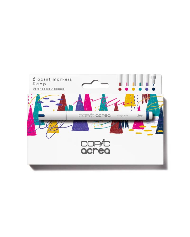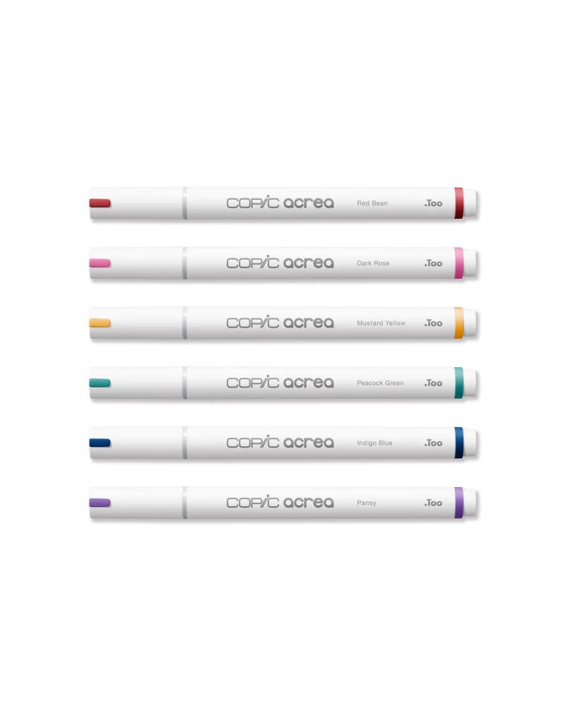 Scopri il pennarelli COPIC Acrea set da 6 colori della linea Deep, un assortimento esclusivo di marker versatili e di alta qualità, perfetti per disegnare, scrivere e decorare su diverse superfici. Questo set include sei tonalità intense: Red Bean, Dark Rose, Mustard Yellow, Peacock Green, Indigo Blue e Pansy, ideali per dare profondità e carattere ai tuoi progetti artistici.