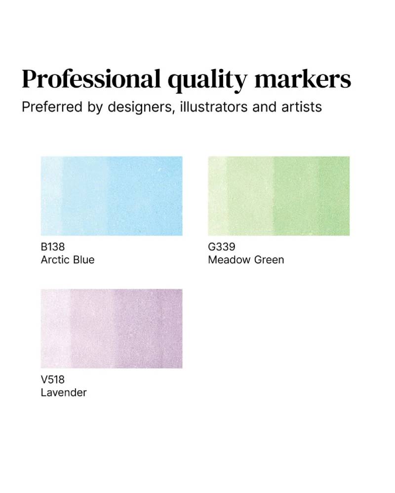 La formula blend-friendly consente di sovrapporre e sfumare i colori con facilità, creando transizioni armoniose e toni freddi perfettamente bilanciati. Allo stesso modo, il Promarker Winsor & Newton può essere utilizzato su carta, plastica, vetro, legno e acetato, permettendo così di sperimentare liberamente su diversi supporti e ampliare la propria creatività.