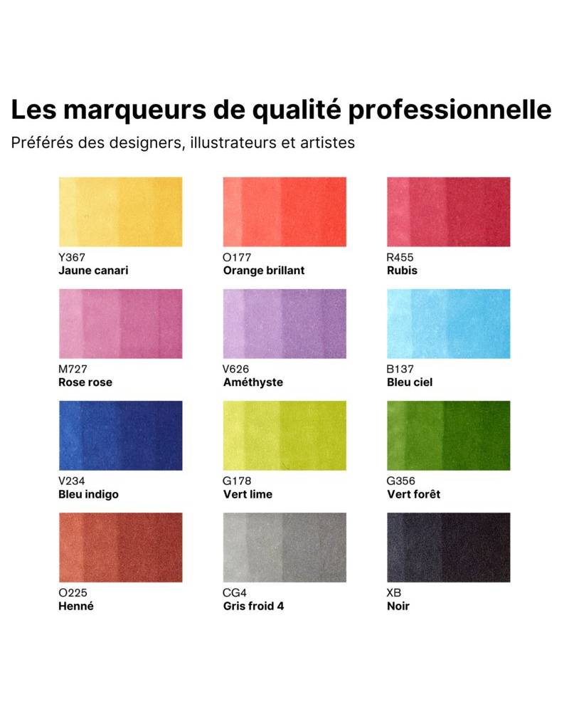 Questo set è composto da 12 colori intensi, ideali per ogni progetto creativo. In più, è incluso un Promarker blender che ti permette di ottenere transizioni morbide tra i colori, espandendo ulteriormente le possibilità artistiche. Se ti stai chiedendo come sfumare i Promarker, il blender è la risposta perfetta: ti consente di creare gradazioni di colore più fluide e sfumature precise.