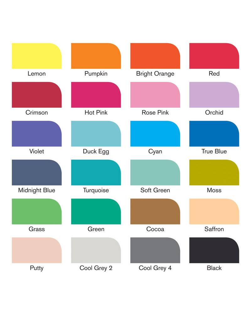 - Tonalità brillanti e vibranti: Lemon, Pumpkin, Bright Orange, Red, Crimson, Hot Pink, Rose Pink, Orchid, Violet