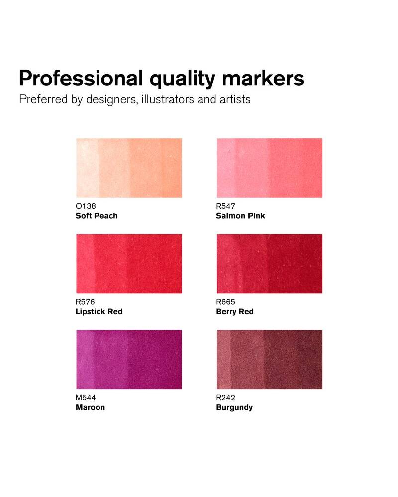 Se sei un professionista o un appassionato d’arte, scegliere il Set Promarker significa investire in uno strumento che ti offrirà precisione, versatilità e qualità superiore. La gamma di toni rossi inclusa in questo set è perfetta per chi cerca un set pennarelli che permetta di ottenere sfumature e colori intensi, dal delicato Soft Peach fino al più profondo Burgundy. La doppia punta, la resistenza alla luce e la facilità d’uso sono solo alcune delle caratteristiche che fanno di questi pennarelli uno strumento indispensabile per ogni artista.