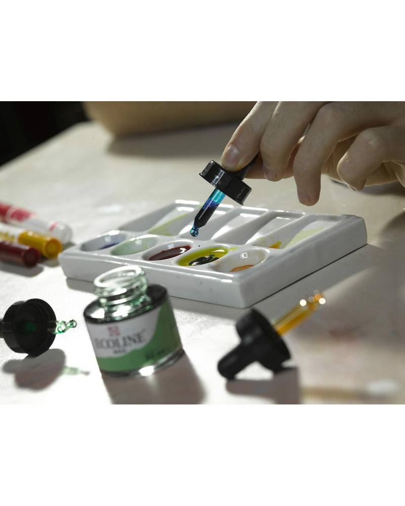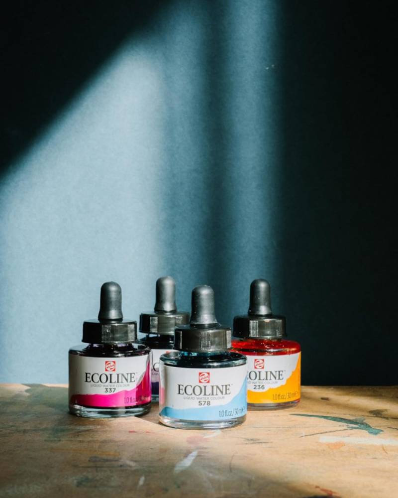 Gli acquerelli liquidi di Ecoline sono realizzati con pigmenti a base di colorante e gomma arabica. Questa formula speciale garantisce un’ottima trasparenza e una perfetta adesione alla carta. Sono perfetti per lavorare su carta bianca o molto chiara, valorizzando la luminosità e la brillantezza dei colori.