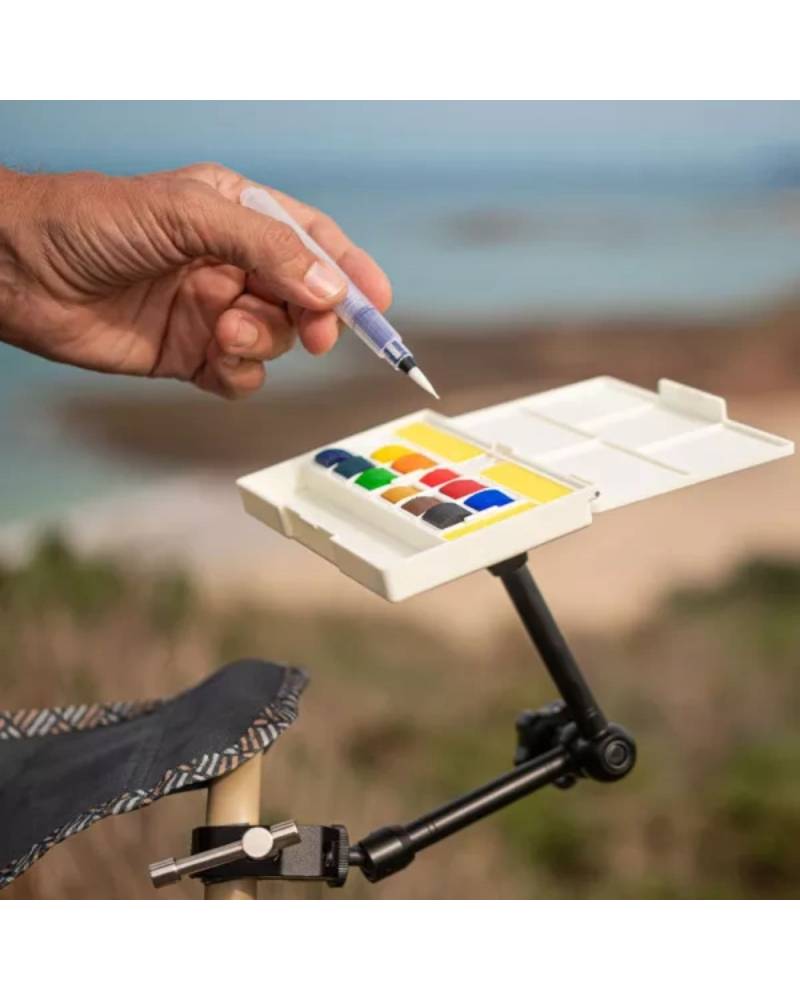 Il braccio snodabile permette di fissare la scatola a diverse superfici, offrendo massima comodità e libertà di movimento. Il pennello con serbatoio integrato garantisce praticità e precisione, rendendo il set perfetto anche come set acquerelli da viaggio.