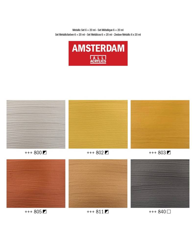 La selezione di colori metallici di questo set colori acrilici Amsterdam è pensata per valorizzare la luce e creare sfumature eleganti: