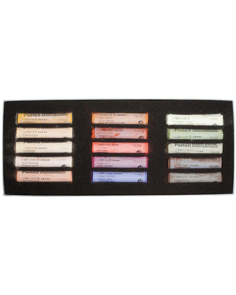 Il set contiene 15 pastelli dei seguenti colori: 014 D ocra oro, 016 O ocra carne, 014 O ocra oro, 021 O Terra Pozzuoli, 021 H Terra Pozzuoli, 018 H terra di Siena bruciata, 022 D rosso inglese, 040 H vermiglione, 047 B ceralacca, 057 D violetto bluastro, 002 O giallo vero 1 limone, 083 H verde Boemia, 093 M grigio verdastro 1, 036 B marrone van dyck, 038 B marrone noce