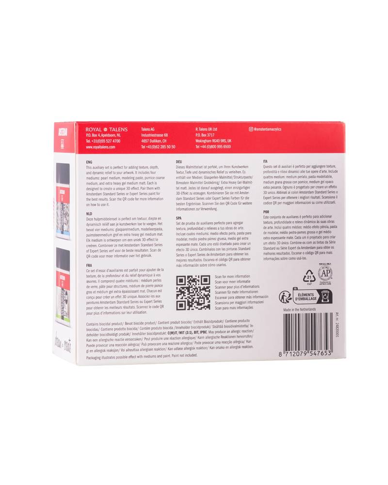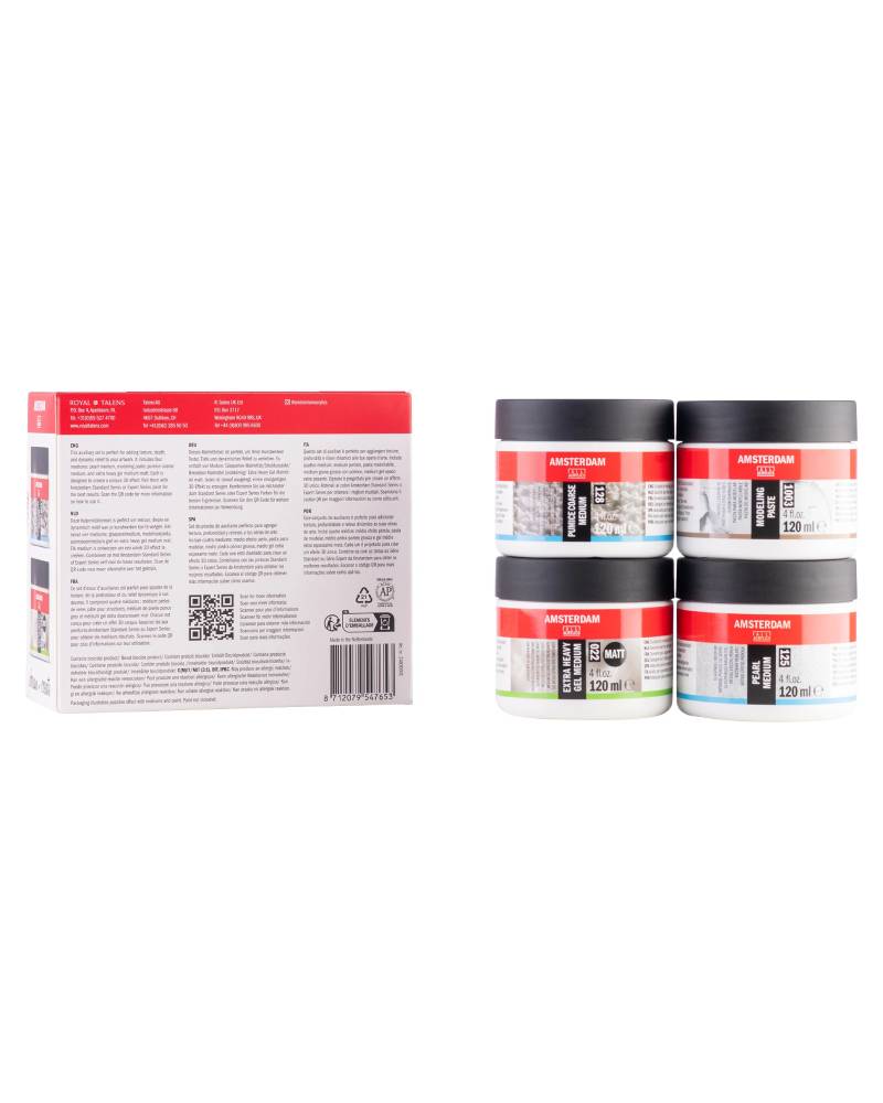 Il set medium acrilici texture Amsterdam è progettato per artisti che desiderano superare la bidimensionalità e lavorare con profondità, rilievi e superfici materiche. Questo kit completo racchiude quattro medium distinti, ognuno con una funzione specifica, pensati per espandere le possibilità espressive della pittura acrilica.