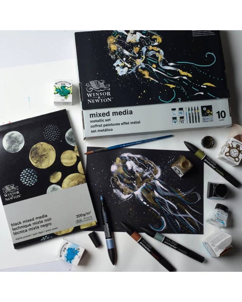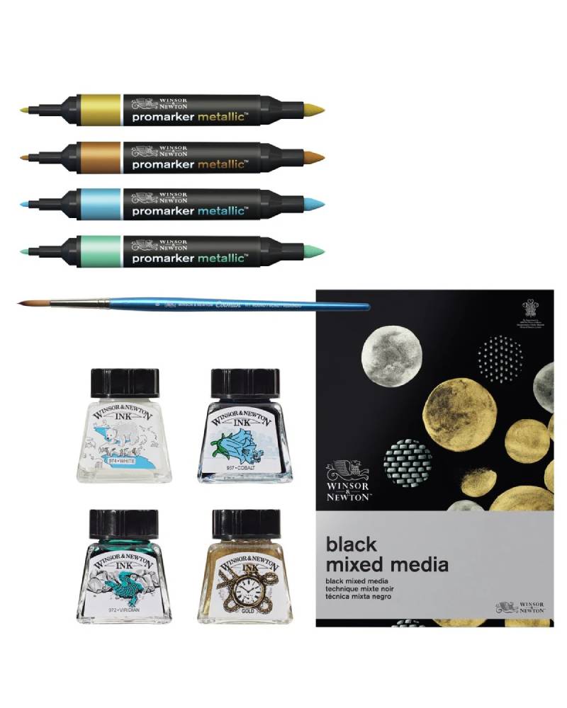 Questo set pennarelli Promarker Winsor & Newton offre una combinazione perfetta di strumenti per chi ama sperimentare con colori metallici e tecniche miste. I pennarelli metallizzati assicurano una copertura uniforme e riflessi luminosi, mentre gli inchiostri consentono di aggiungere dettagli nitidi e contrasti intensi. Il pennello permette di sfumare, mescolare e arricchire le illustrazioni con effetti artistici sofisticati.